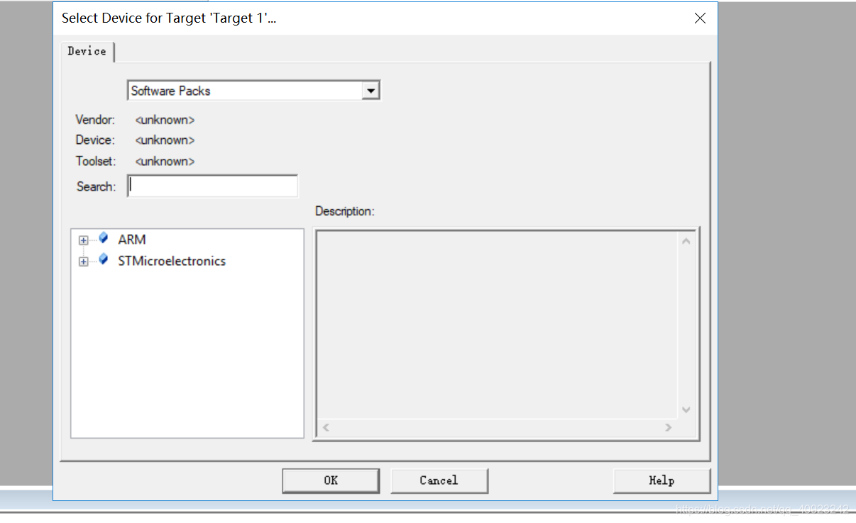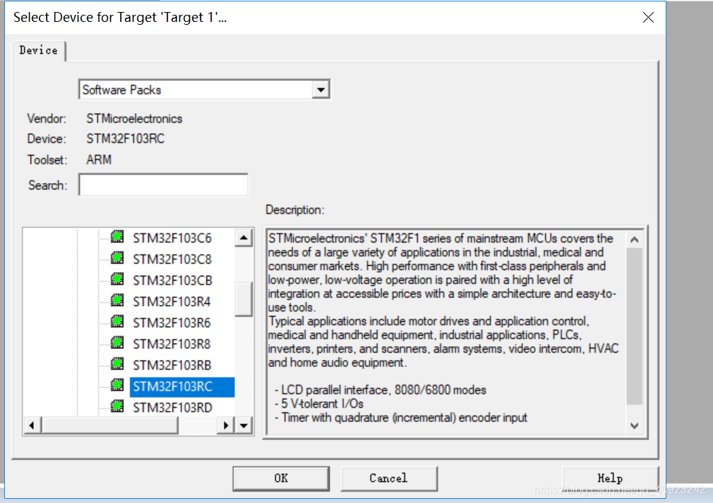 (3) 打开之后出现这个对话框。接着我们选择STMelectronics->STM32F103->STM32F103RC(点击的都是这个目录前面的+号)。完成之后点击OK