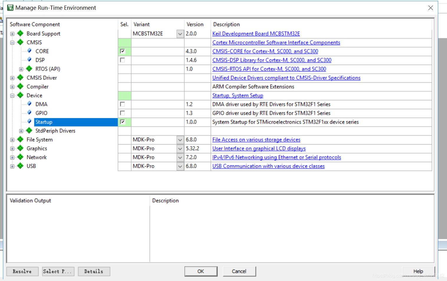 (4)点击OK完成之后出现这个对话框,我们一次勾选CMSIS下的CORE、Device下的Startup。然后点击OK