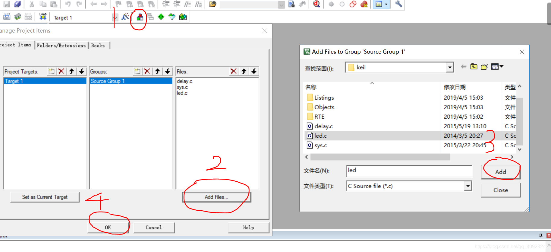 (6)然后依次点击下图我们用红笔选中的图标 。将sys.c和delay.c以及led.c添加进去(添加成功之后在下图的files地下就可以看见我们成功添加进去的文件了)