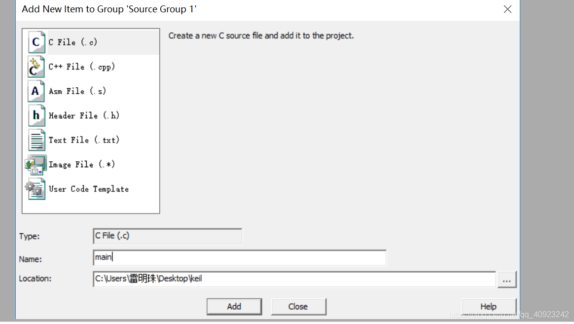 然后右键点击左侧的任务栏下面的Source Group -->And new item-->C file(.c),接着在下面的name下面填写名字:main.最后点击OK