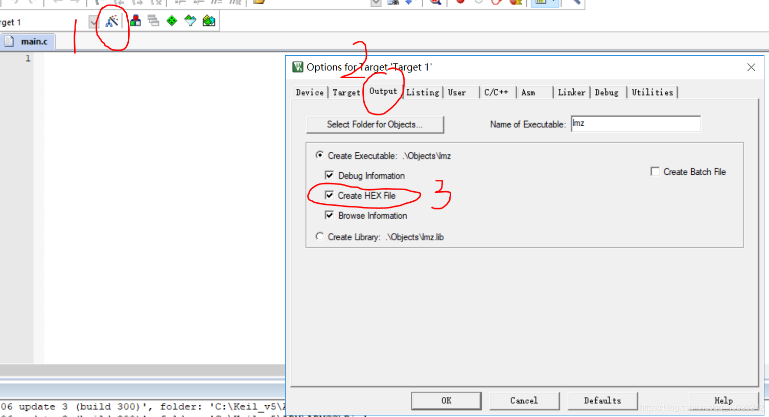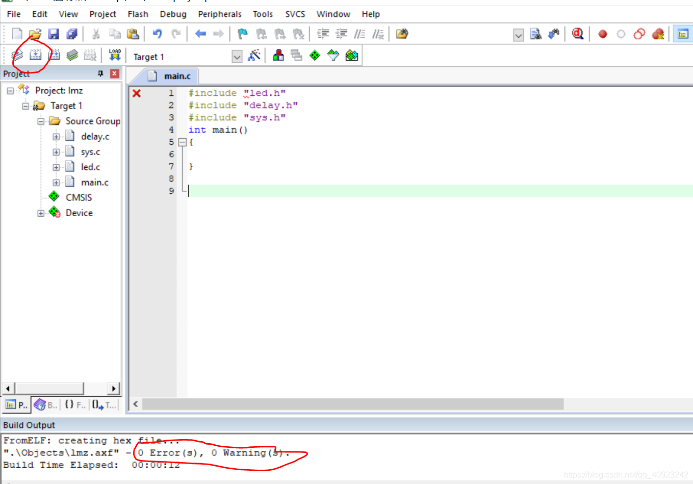(10)最后我们在main.c这个文件里面加进去头文件。点击编译(图中圈出来的图标)。发现底下0 warning 0error。这样,我们的工程就完全建立好了。