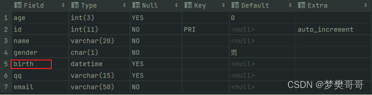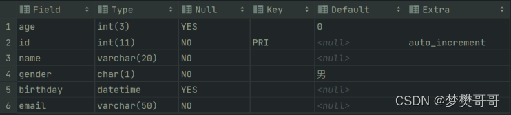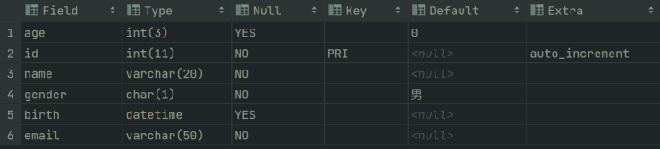 desc 表名称;desc t_stu;