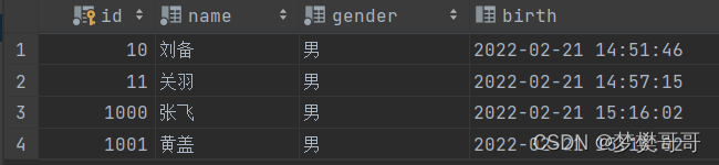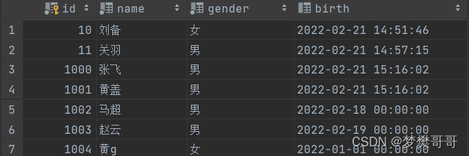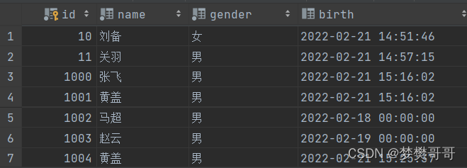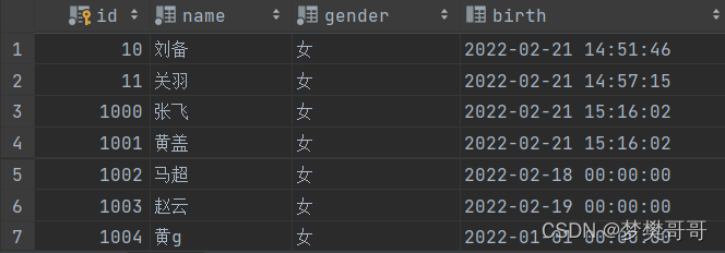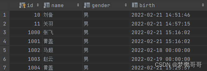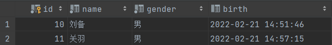insert into t_stu(id,name,gender,birth) values(11,'关羽','男',now());