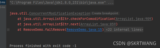 }也就是说,remove 的时候触发执行了 checkForComodification 方法,该方法对 modCount 和 expectedModCount 进行了比较,发现两者不等,就抛出了 ConcurrentModificationException 异常。