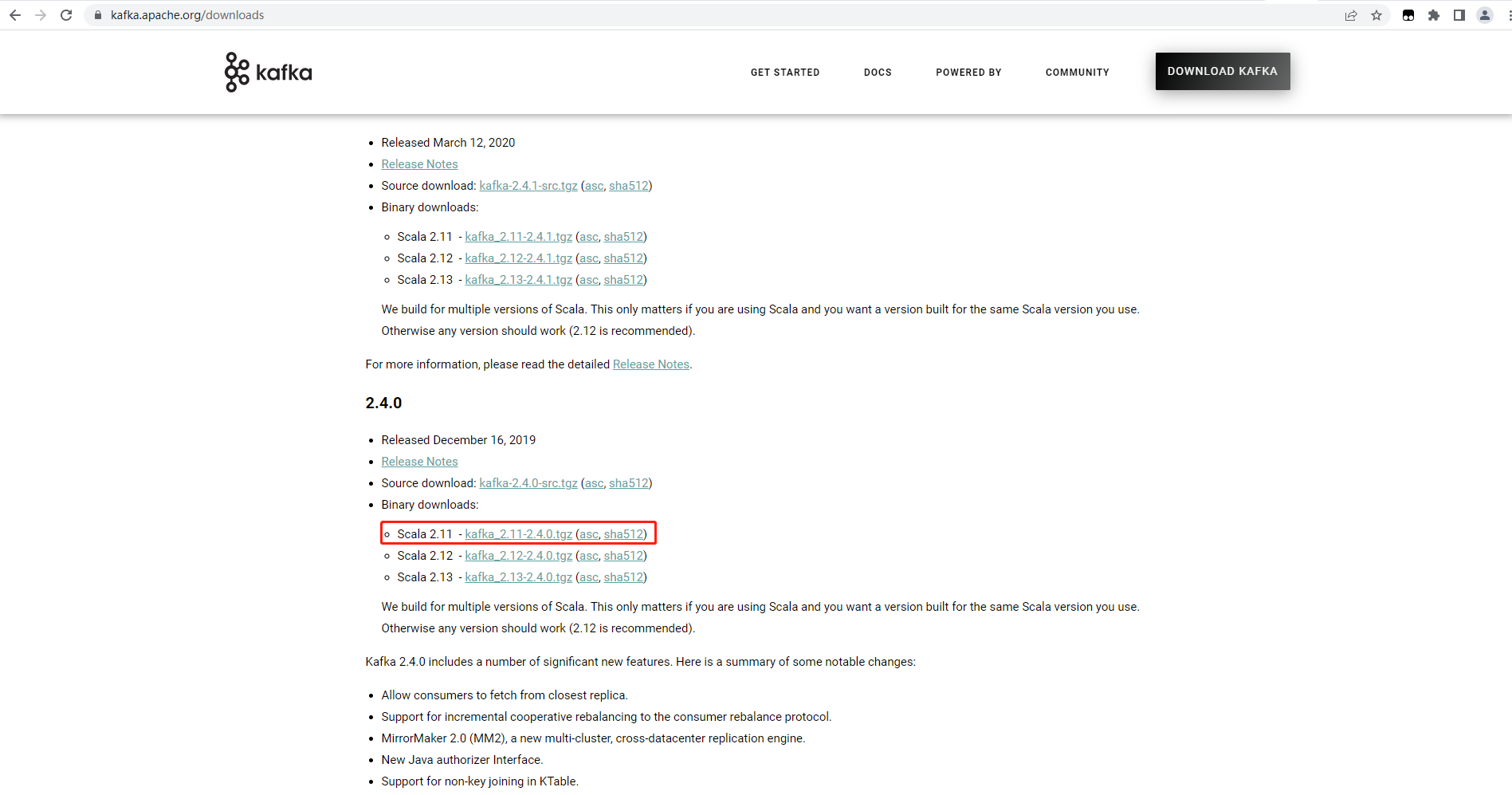 最近需要使用消息队列推送实时数据给第三方的公司,但是生产消息的服务节点在内网服务器,kafka也只能部署在另一台有公网ip的公司另一台服务器(不然第三方无法消费),配置信息有点特殊,于是浅显地做了个单节点的demo,我自己使用的是2.4.0的版本,下载地址https://kafka.apache.org/downloads