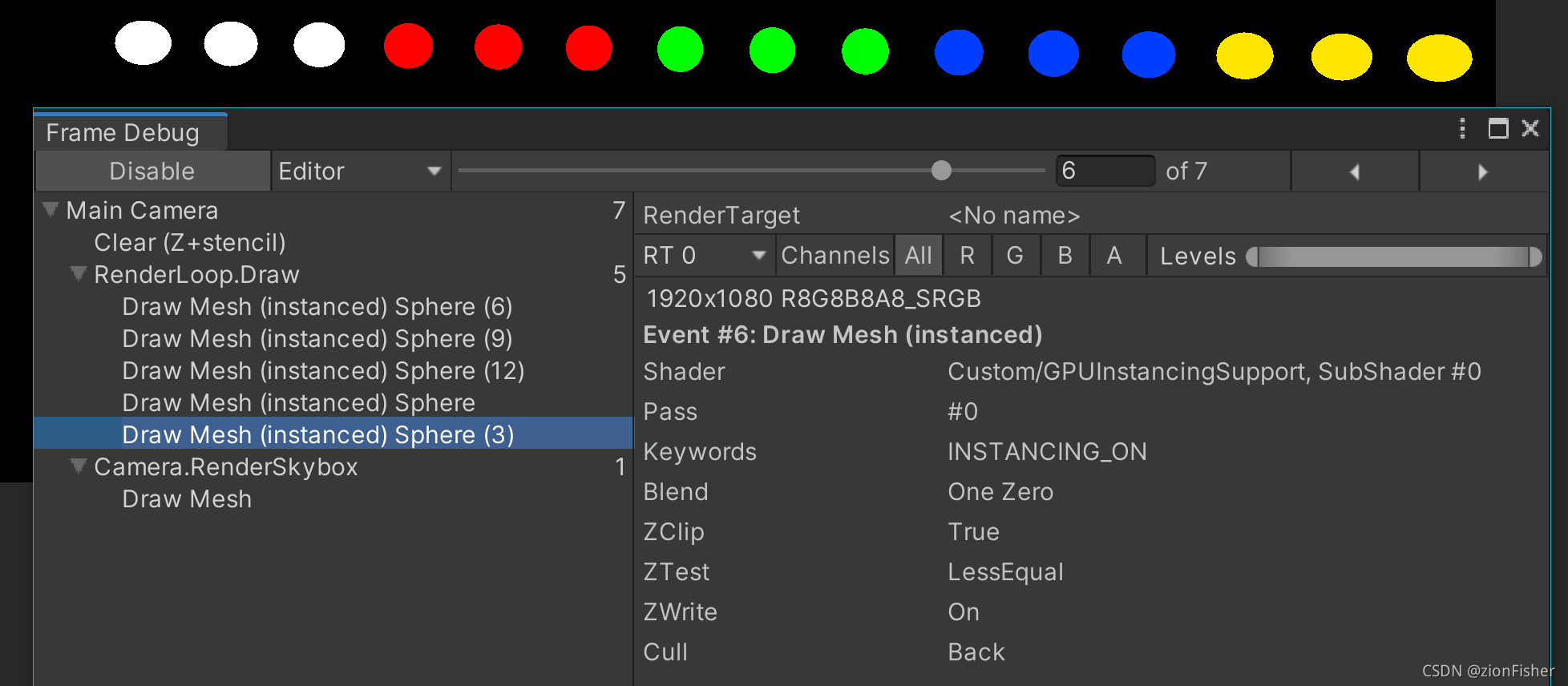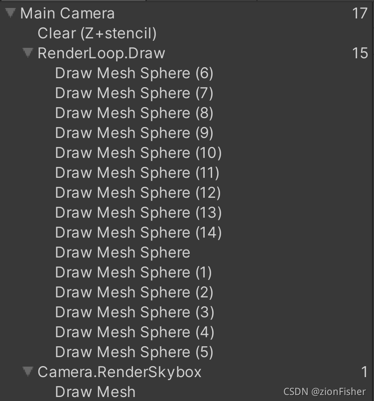 虽然 Sphere 数量有 15 个,但我们可以发现 Draw Call 数量仅仅为 6,其中有一个是用于画 skybox 的,因此渲染 15 个 Sphere 一共只需要 5 个 Draw Call,这就是 GPU Instancing 的力量,大幅减少了 Draw Call。