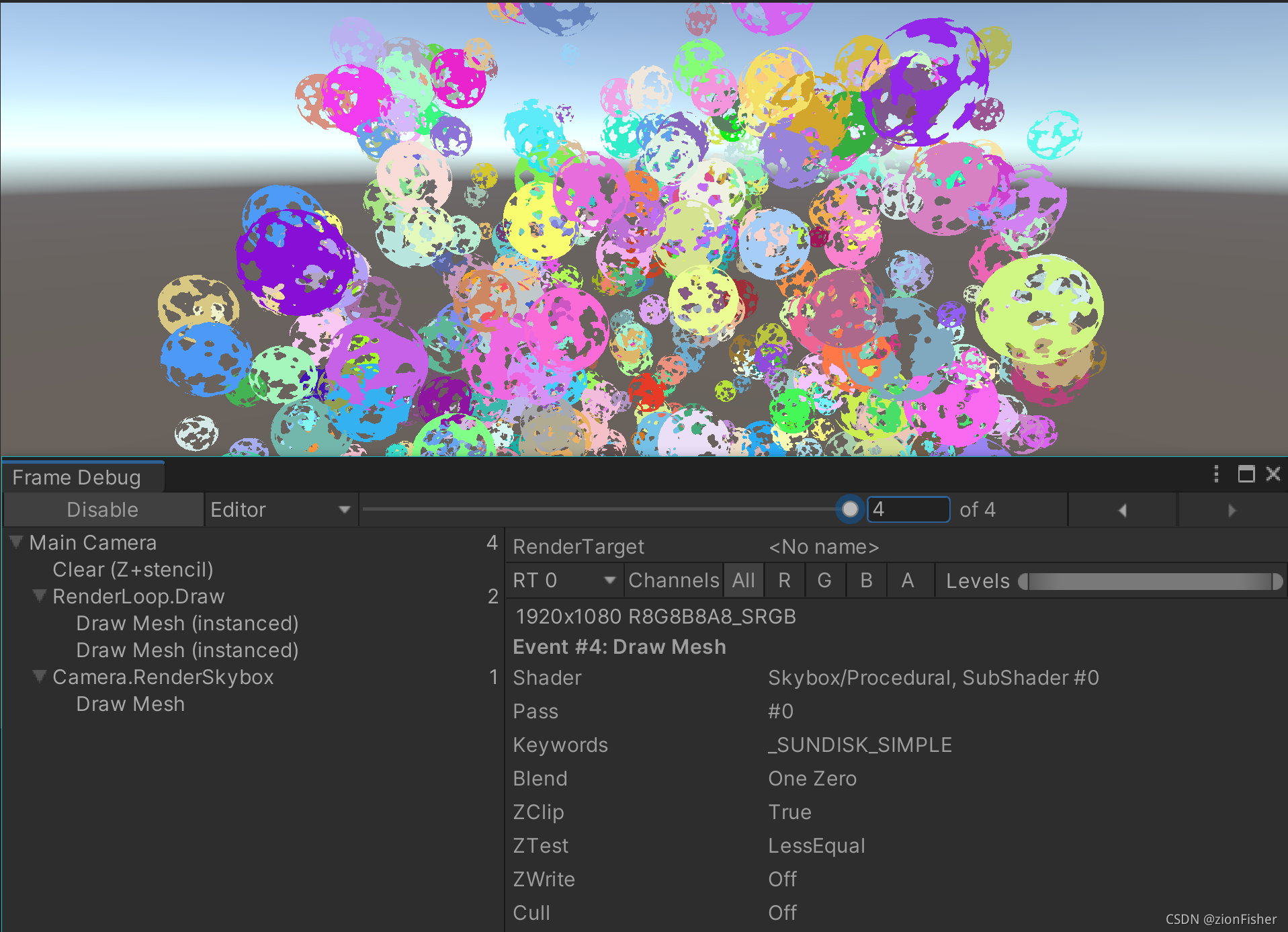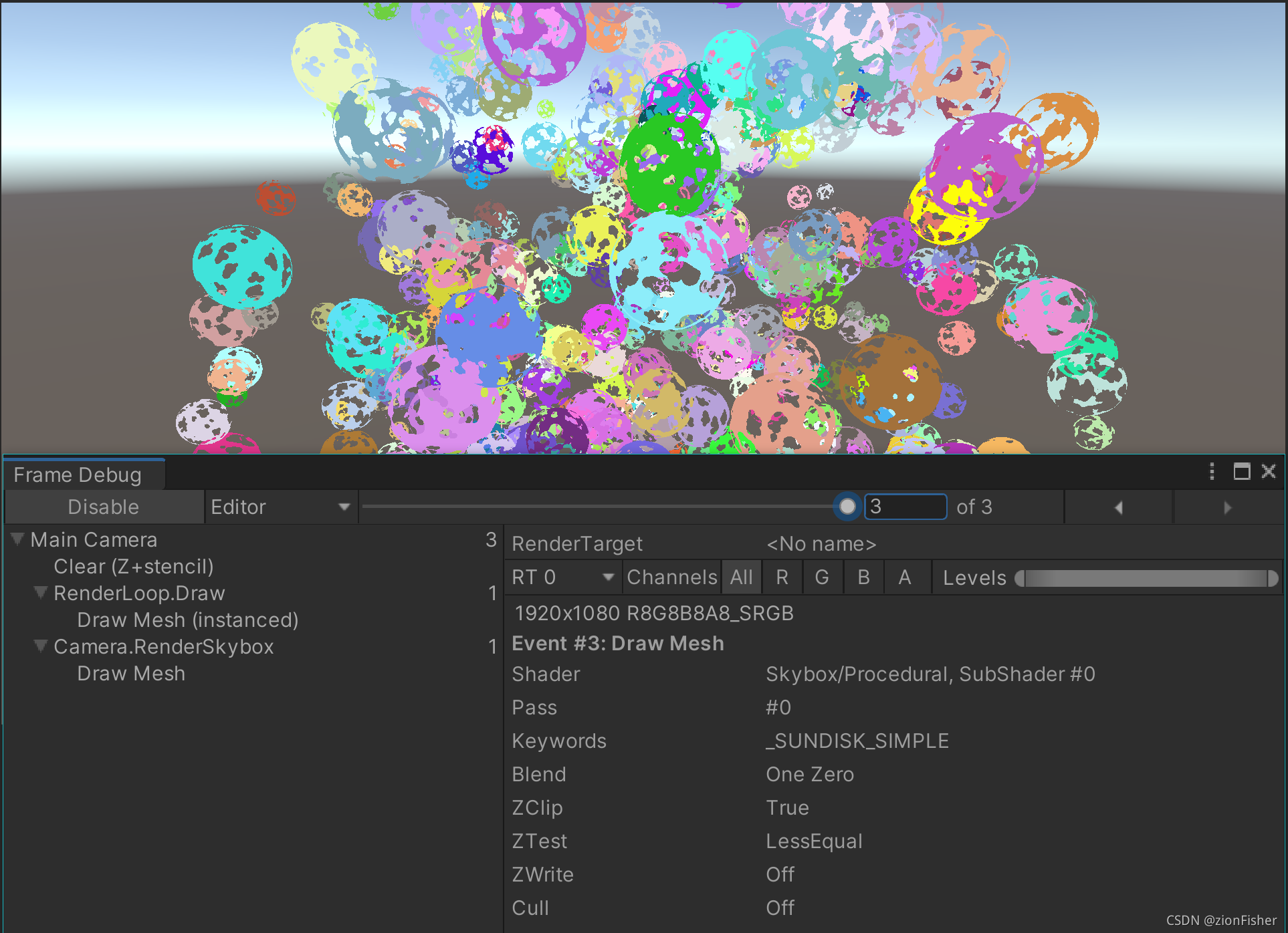 当场景中有 500 个 Sphere 时,只用一个 Draw Call 就可以渲染完成:
