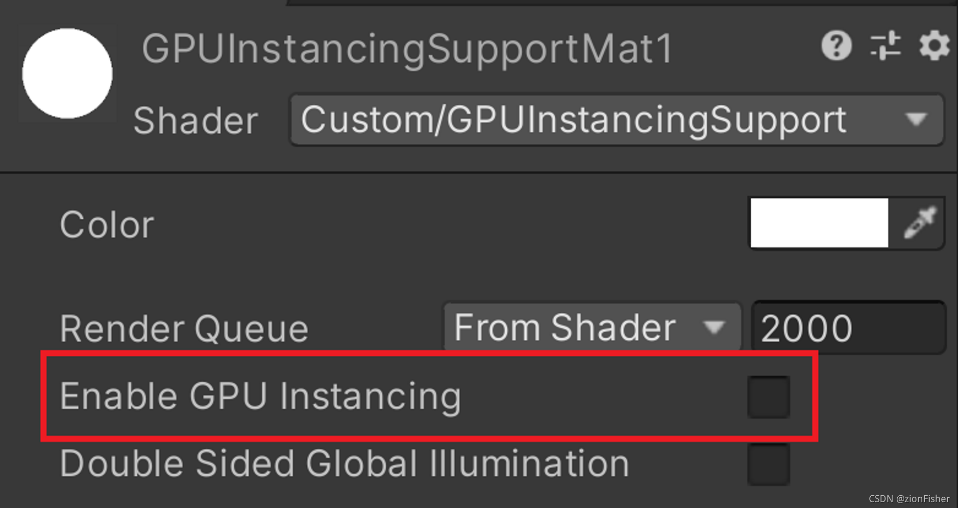 我们将上述 Shader 赋值给新建的 Material,可以在 Inspector 中观察到有一个新的 toggle:Enable GPU Instancing。