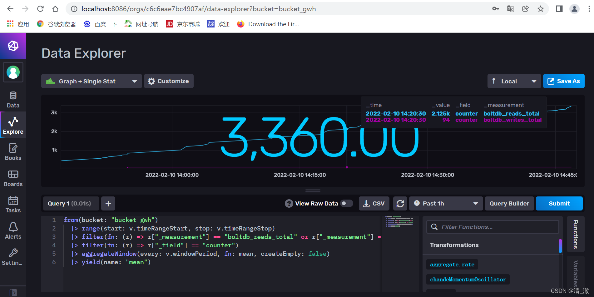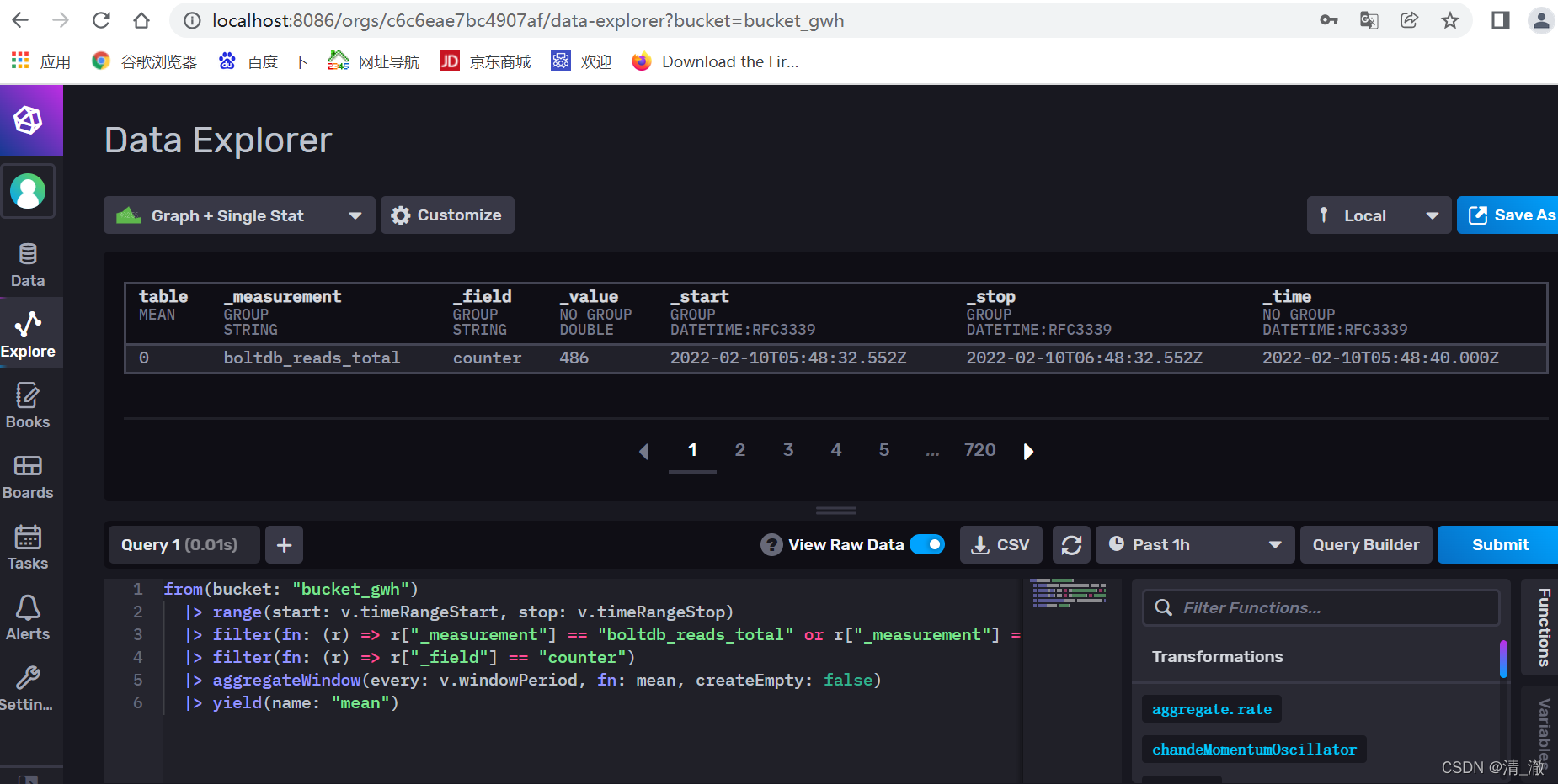 下图:查询 “bucket_gwh”桶(相当于mysql的数据库)的,“boltdb_reads_total”的measurement(相当于mysql的表),的“counter”的field(相当于mysql的列)的value数据