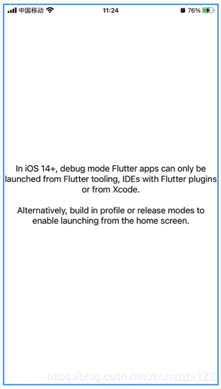 在iOS 14+中,调试模式的Flutter应用只能从Flutter工具中启动,如具有Flutter插件的IDE(Android Studio、VSCode) 或使用Xcode。