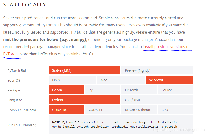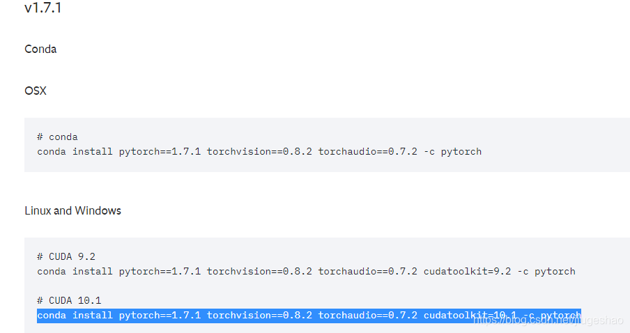 由于在下面页面上没有看到对应10.1的版本,故可点击install previous versions of PyTorch