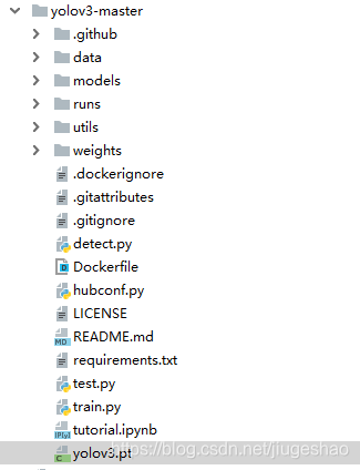 此时查看文件,发现需要yolov3.pt(默认参数),但该文件并没有随git该目录时一起下载,github博主提供了这些文件的下载路径,