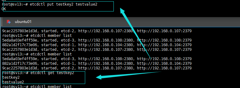 然后在活着的两台机器上其中一台put一个值,另一台是可以get到的。