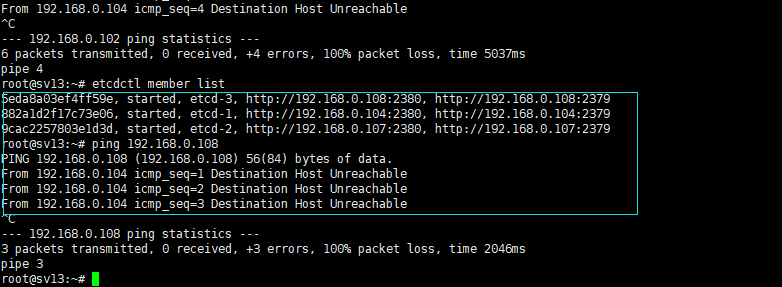 5.最后提醒一下,就是etcdctl member list 这个命令不是获取在线的节点信息的意思哈,这个地方容易误解,比如我现在已经关掉了108这个节点(彻底关机,不是单纯退出etcd)