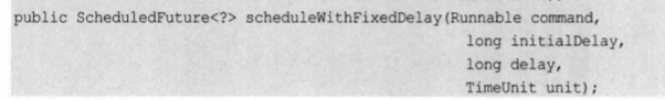 如果是scheduleWithFixedDelay,则任务开始于初始延时时间,前一个任务结束时到下一个任务开始时,其中的时间间隔是long delay。