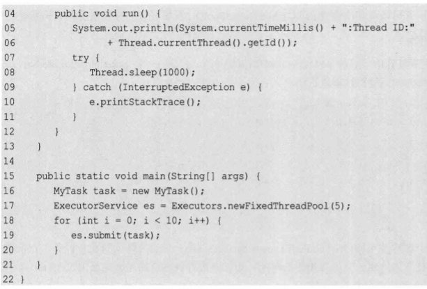 17行代码创建内有5个线程的线程池,18行代码提交十个任务。