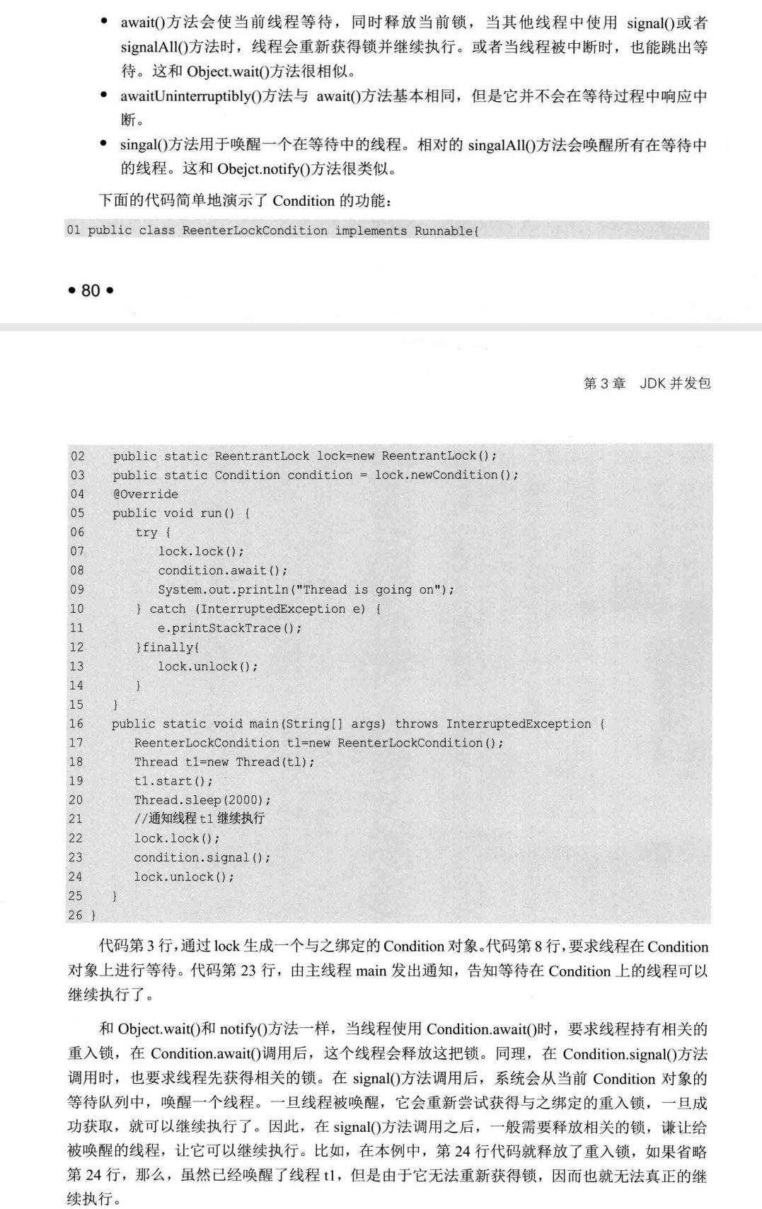 第24行主线程unlock了重入锁,这样condition.signal()后,t1才能重新获得锁。
