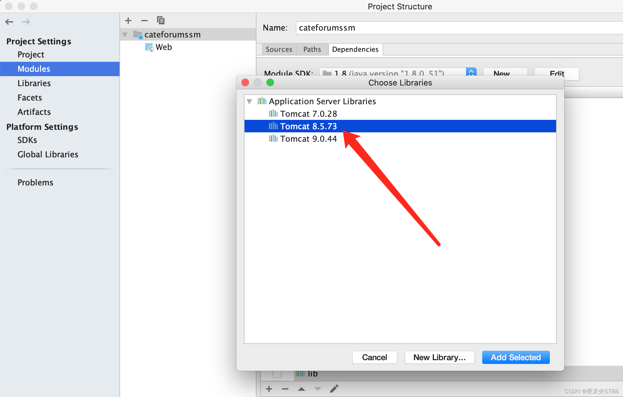 3.我们可以看到之前配置过Tomcat的Jar包,但是由于路径或版本问题,需要将原来的版本删除,重新添加。即选中红色的Tomcat,点击减号删除掉。