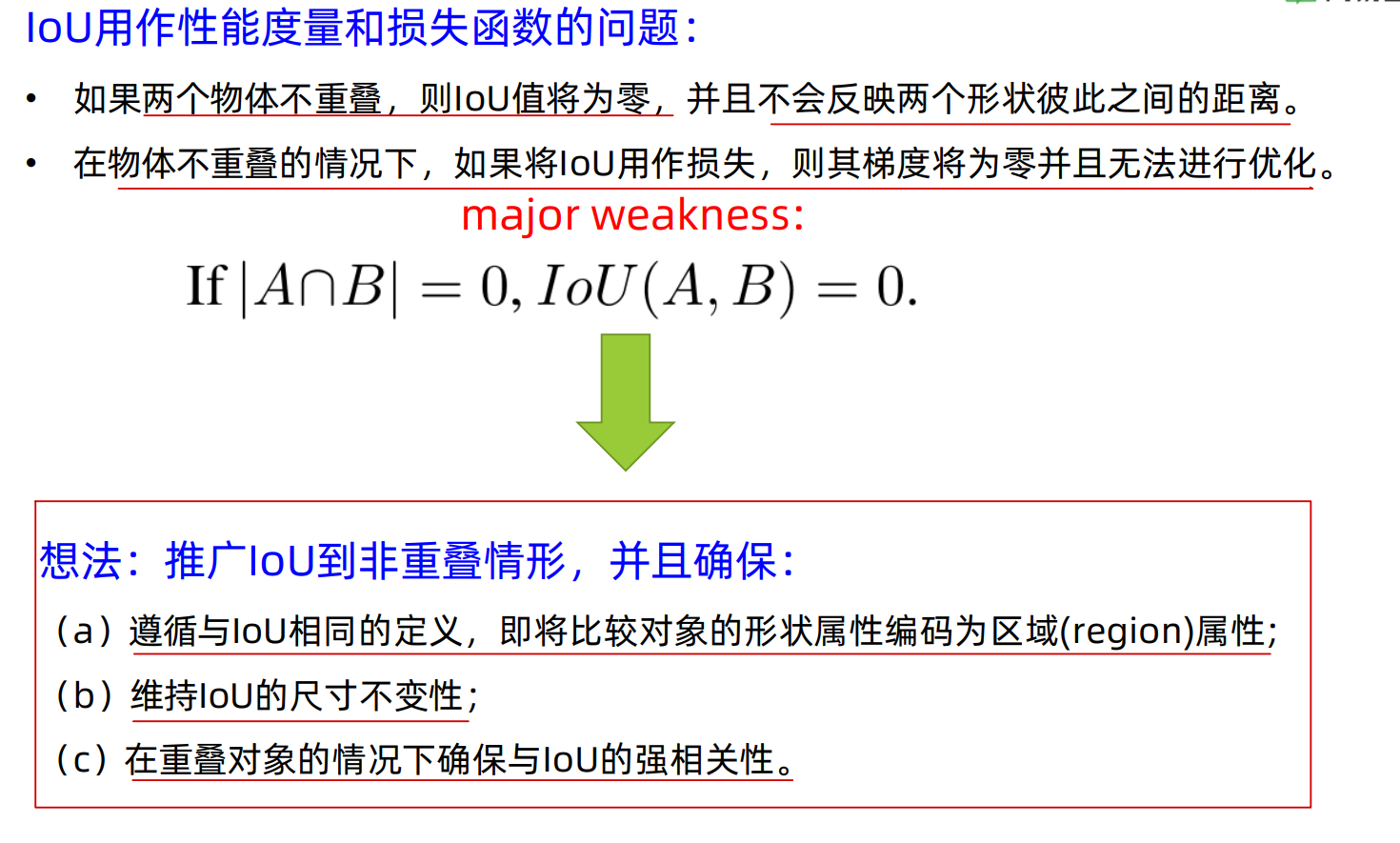 · 如果两个框没有交集,则IOU=0,不能反映两者距离的大小,并且loss=0,没有梯度回传,神 经网络无法学习;