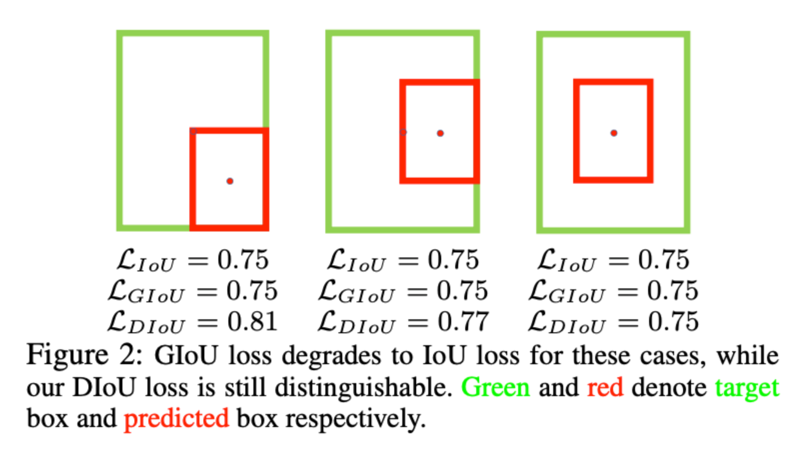 GIoU Loss虽然解决了IoU Loss中Loss为0的问题,但是依然存在一些不足。