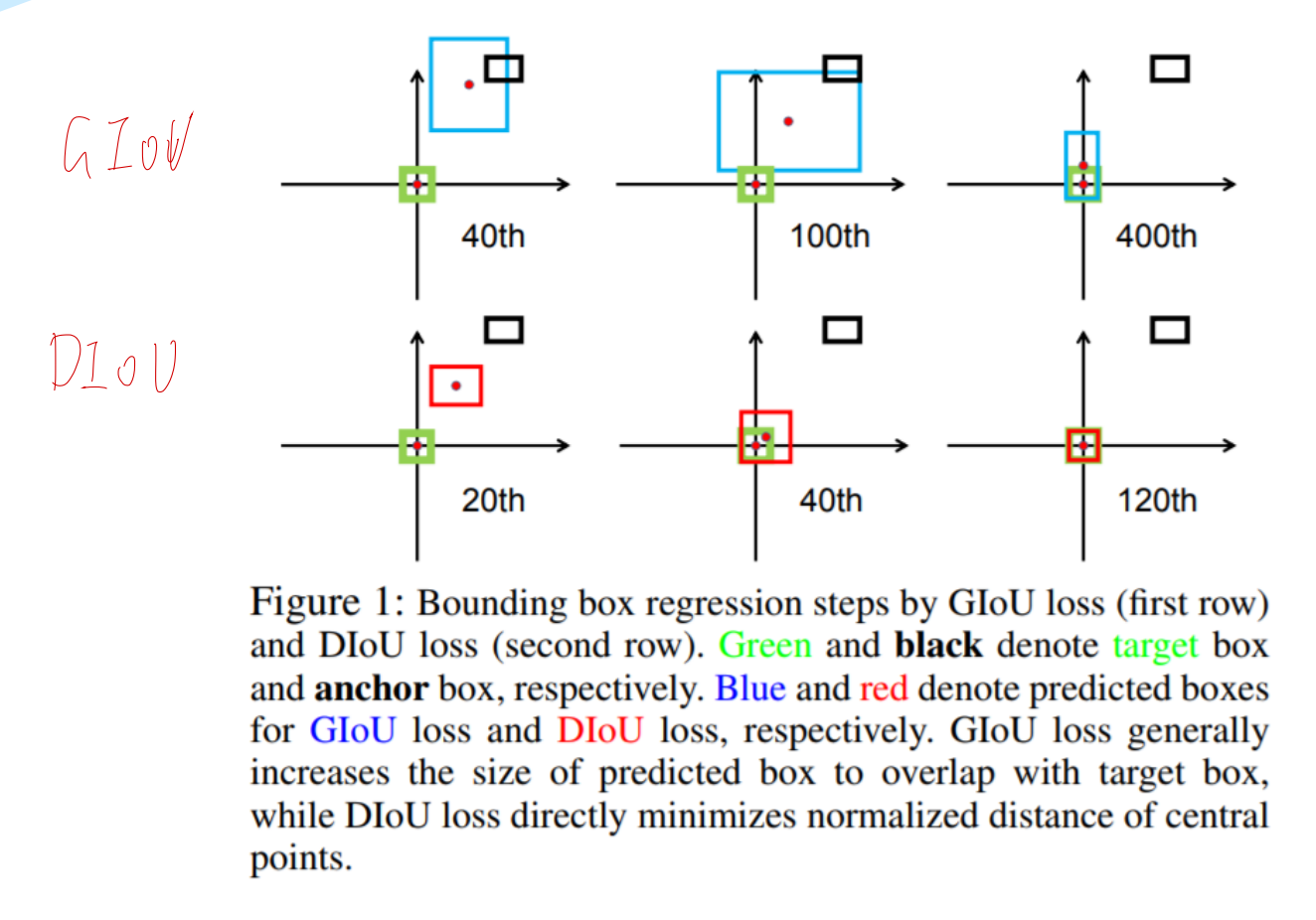 首先,因为GIoU主要是在收敛Ac-U这个值,这么收敛会导致网络优先选择扩大bounding box的面积来覆盖ground truth,而不是去移动bounding box的位置去覆盖ground truth。