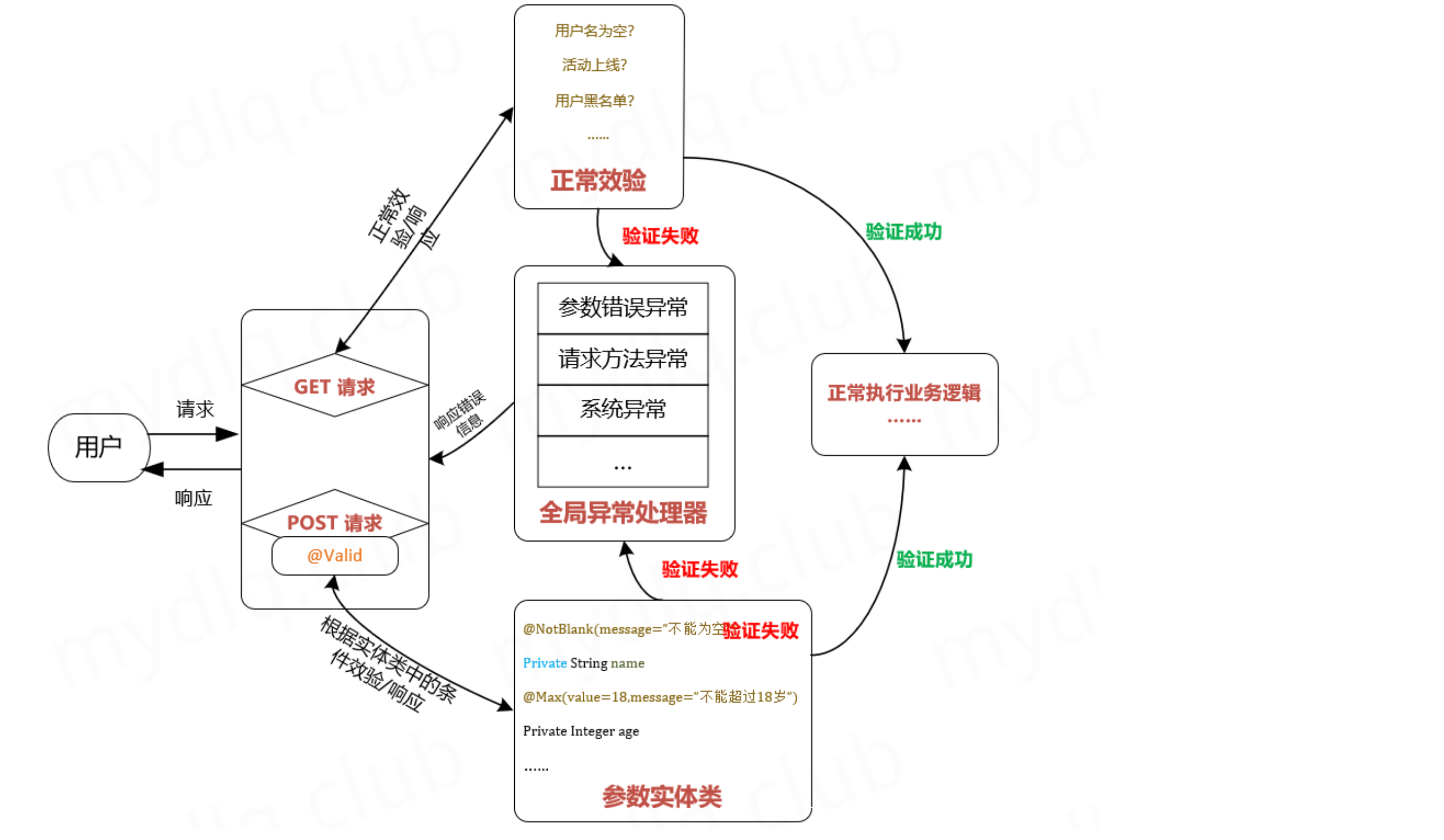 使用 Validation API 进行参数效验步骤整个过程如下图所示,用户访问接口,然后进行参数效验 ,如果效验通过,则进入业务逻辑,否则抛出异常,交由全局异常处理器进行处理