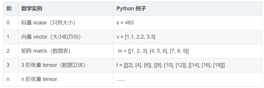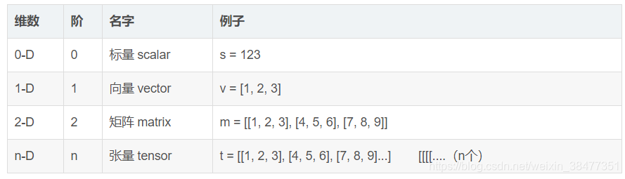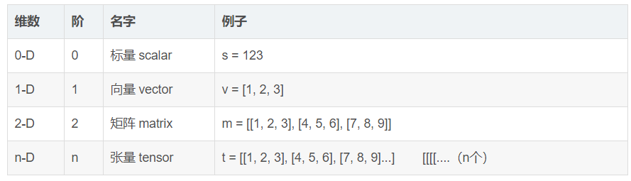 1、张量(Tensor):多维数组(列表)。阶:张量的维数(dim)。