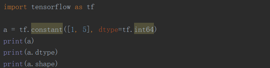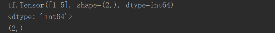 创建一个一阶张量,里面有两个元素 1 5,指定数据类型是 64 位整型,赋值给 a。打印出 a,打印出 a 的数据类型,打印出 a 的形状。
