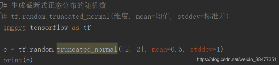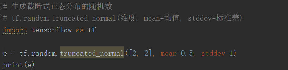tf.random.truncated_normal 生成两行两列的张量,里面的元素符合以 0.5 为均值,1 为标准差的随机数。而且这些元素都在两倍标准差之内,数据更向均值 0.5 集中。