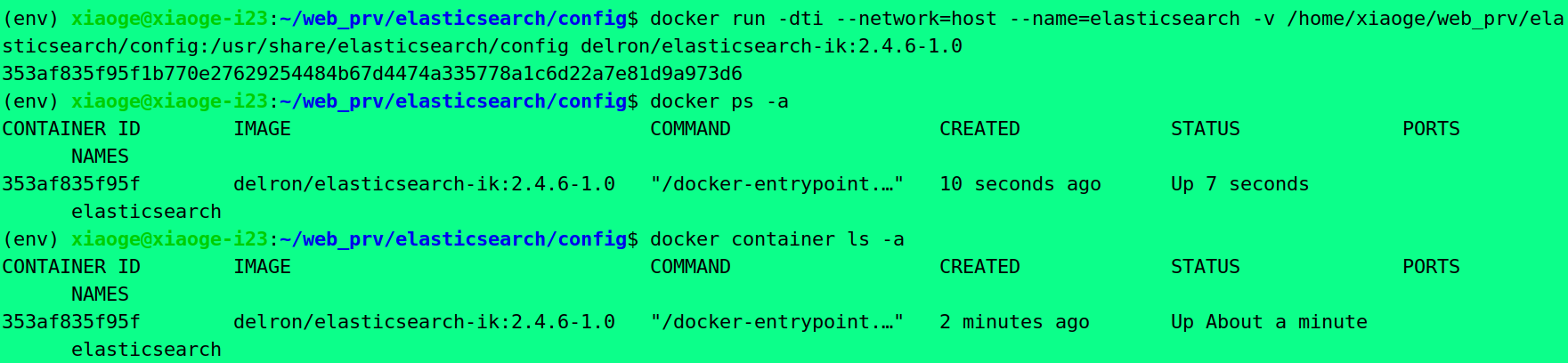 docker run -dti --network=host --name=elasticsearch -v /home/xiaoge/web_prv/elasticsearch/config:/usr/share/elasticsearch/config delron/elasticsearch-ik:2.4.6-1.0
