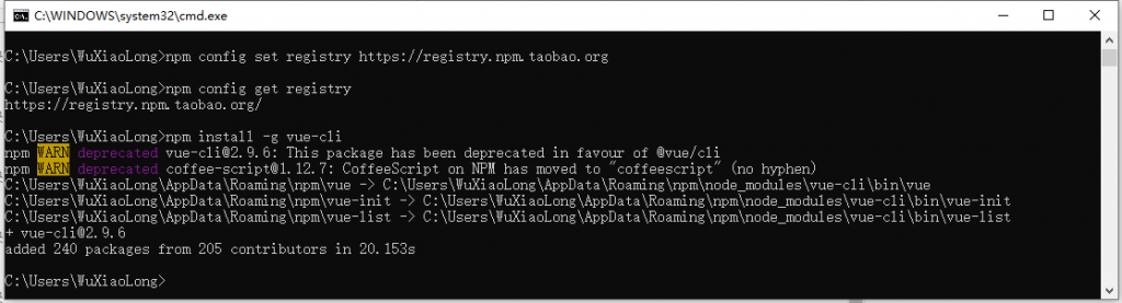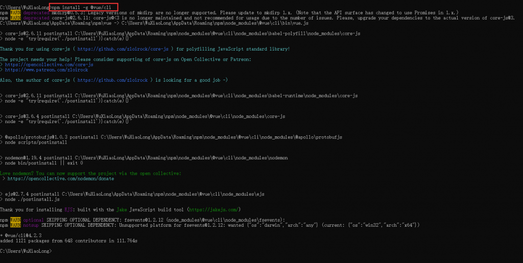 npm config get registry之后,使用 npm install -g @vue/cli 安装脚手架 。这里的-g是–global的意思,就是全局安装,所以如果使用的是mac系统,执行该命令需要在前面加上sudo。