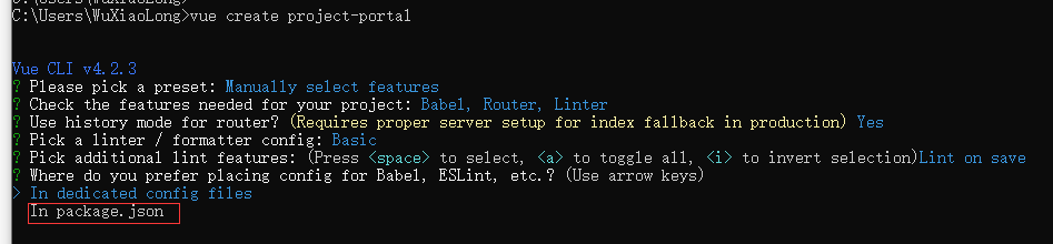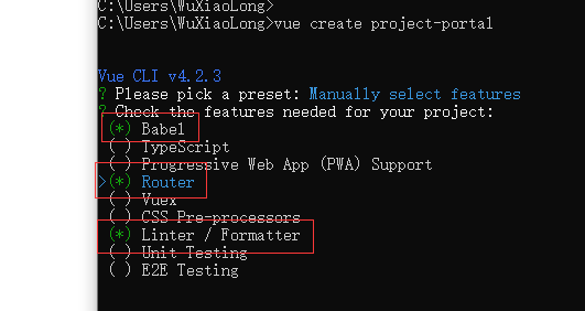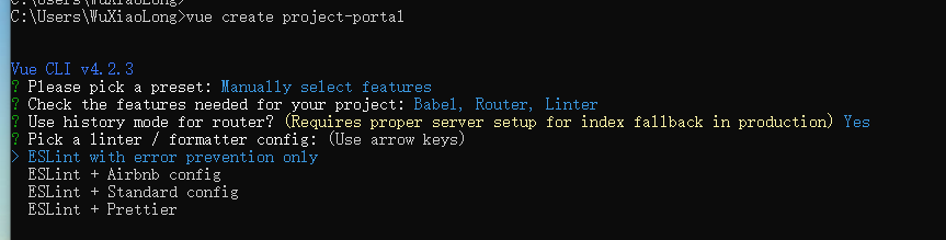 使用 vue create project-portal 在当前路径下创建项目,这里的project-portal是自定义的前端项目的名字。