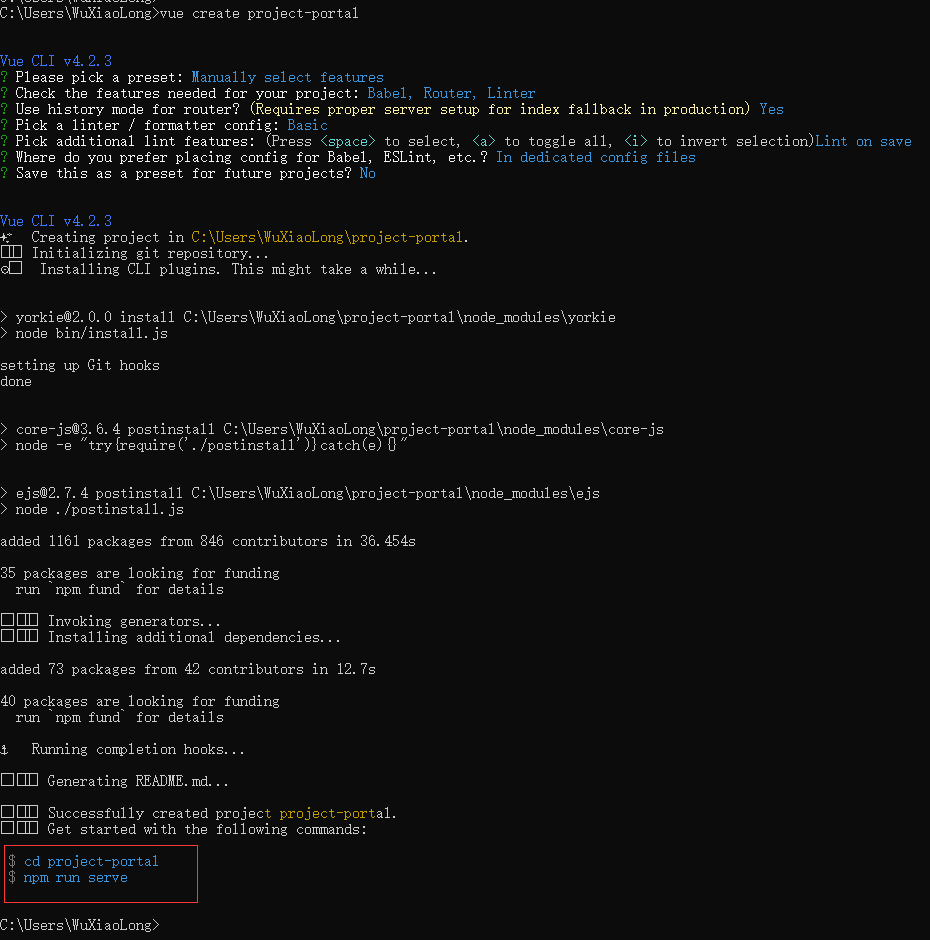 这样我们的项目就搭建好了,在命令行的最下面有两个命令,通过cd project-portal进入项目文件夹;通过npm run serve运行项目后,就可以通过浏览器输入http://localhost:8080访问到项目了。这里我们先不操作。