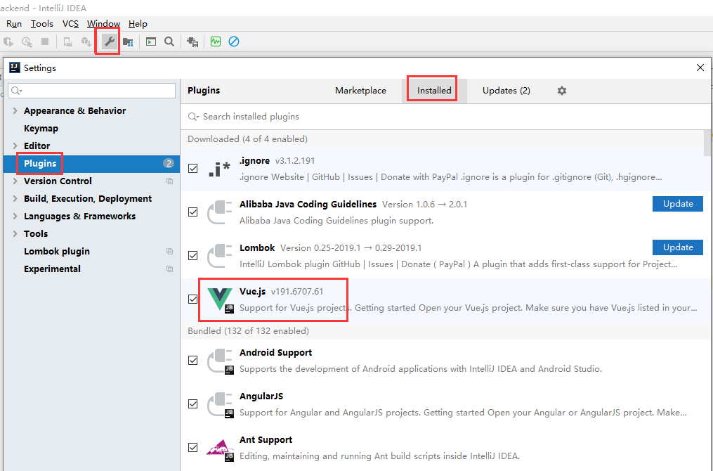 打开idea后,首先查看idea是否安装了vue.js插件,如果没有安装或者安装不了,请参考:http://wuxiaolong.tech/?p=419