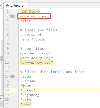 该文件说明,在我们使用git做项目管理时,哪些文件是需要忽略的,不上传git服务器,这里我们需要做相应的配置,让部分文件在push到git服务器时,忽略上传;这里特别需要注意的是node_modules目录,这个目录中放置的是依赖包,这里要忽略掉,因为依赖文件比较大,上传下载都比较耗时;新用户git clone完成项目后,在该项目中通过执行npm install即可在公网下载相关的依赖。同时/dist是项目打包的目录,也不用上传git。这里我的配置如下: