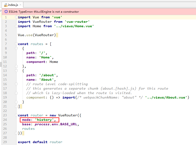 这个文件是我们的路由配置专用文件。上面我们通过vue-cli构建项目时,路由方式是history,在文件中可以看到。后续我们会修改这种路由方式。