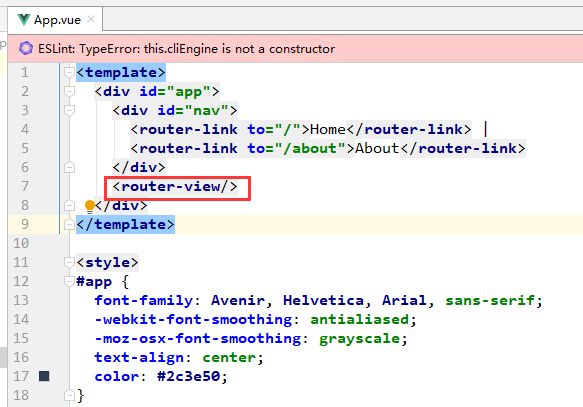 这个文件中关键的是<router-view/> ,是一个容器,名字叫“路由视图”,意思是当前路由( URL)指向的内容将显示在这个容器中。也就是说,其它的组件即使拥有自己的路由(URL, index.js 文件里定义),也只不过表面上是一个单独的页面,实际上只是在根组件 App.vue 中。