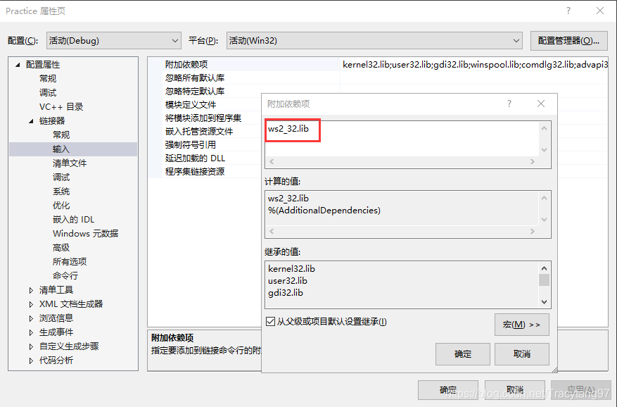2.3 (必不可少的一步,虽然我也不知道有什么用)在Server和Client两个项目上 务必都要右击 -- 属性 -- 链接器 -- 输入,然后在“附加依赖项”这一栏右侧点击下三角 -- 编辑,在最上方空白处输入 ws2_32.lib ,然后一直点击 确定 即可,如下图:
