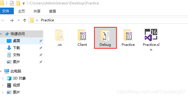2.6 按F7编译,经过以上操作以后应该不会报错了,在Practice项目文件夹下会生成一个名为Debug的文件夹,点击进去,会发现有两个分别名为“Server.exe”和“Client.exe”的可执行文件,如下图:
