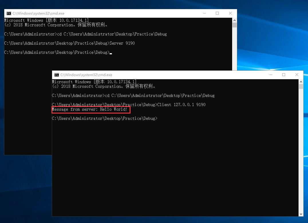 接着在另一个命令行输入“Client 127.0.0.1 9190”,然后按回车。这句话的作用是运行客户端,访问127.0.0.1这个IP地址(这是自己主机的IP地址),端口号为9190(必须与Server的端口号一致才能通信)。按下回车后该窗口(即客户端Client)会收到服务器端(即Server)发送的“ Hello World!”,通信完毕