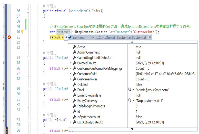 (4)、在Controllers.CustomerController.Index方法的return View();语句前设置断点,按F5执行程序后,可以很直接的看出程序能够从一个指定的Session实例中获取,一个指定的实体实例及其相应的数据信息。