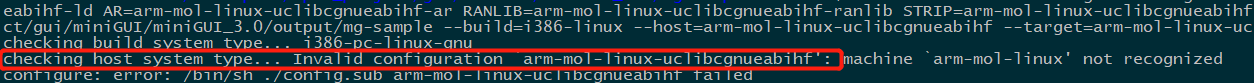 CC=arm-mol-linux-uclibcgnueabihf-gcc CPP=arm-mol-linux-uclibcgnueabihf-cpp LD=arm-mol-linux-uclibcgnueabihf-ld AR=arm-mol-linux-uclibcgnueabihf-ar RANLIB=arm-mol-linux-uclibcgnueabihf-ranlib STRIP=arm-mol-linux-uclibcgnueabihf-strip ./configure PKG_CONFIG_PATH=/home/test/miniGUI_3.0/output/minigui-core/lib/pkgconfig --build=x86_64-linux --host=arm-mol-linux-uclibcgnueabihf --target=arm-mol-linux-uclibcgnueabihf
