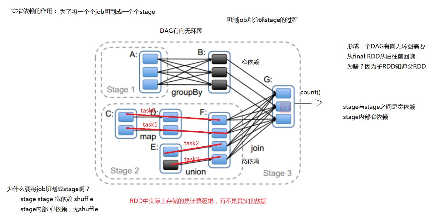 宽窄依赖的作用是:将job切割成多个stage.从祖先RDD开始找,如果是窄依赖继续往下找,以宽依赖为切割点,分为2个stage