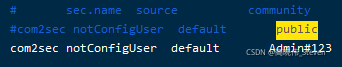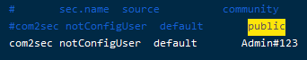 修改配置文件/etc/snmp/snmpd.conf将Public改成其他具有复杂度的字符串如Admin123...,保存后重新启动SNMP服务即可。