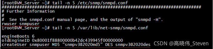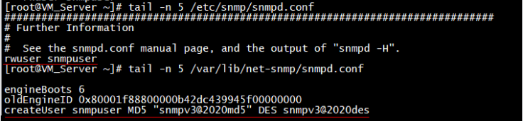 使用net-snmp-create-v3-user命令进行snmp v3配置(需要再snmp服务停止的状态下才能生效)[root@VM_Server ~]# net-snmp-create-v3-user Enter a SNMPv3 user name to create: snmpuser Enter authentication pass-phrase: snmpv3@2020md5 Enter encryption pass-phrase: [press return to reuse the authentication pass-phrase] snmpv3@2020des adding the following line to /var/lib/net-snmp/snmpd.conf: createUser snmpuser MD5 "snmpv3@2020md5" DES snmpv3@2020des adding the following line to /etc/snmp/snmpd.conf: rwuser snmpuser生效后可以查看到配置文件中的新增
