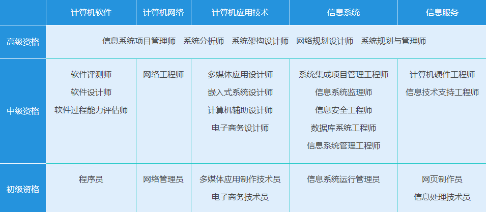 以下是软考五大专业领域里比较火,用处较大的专业资格考试: