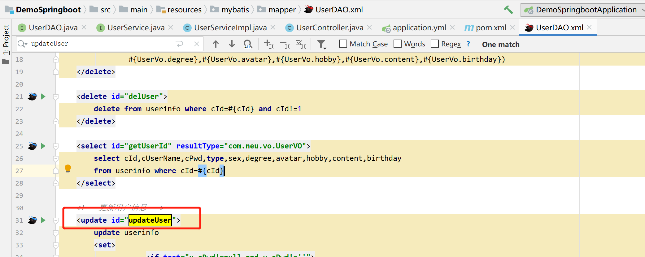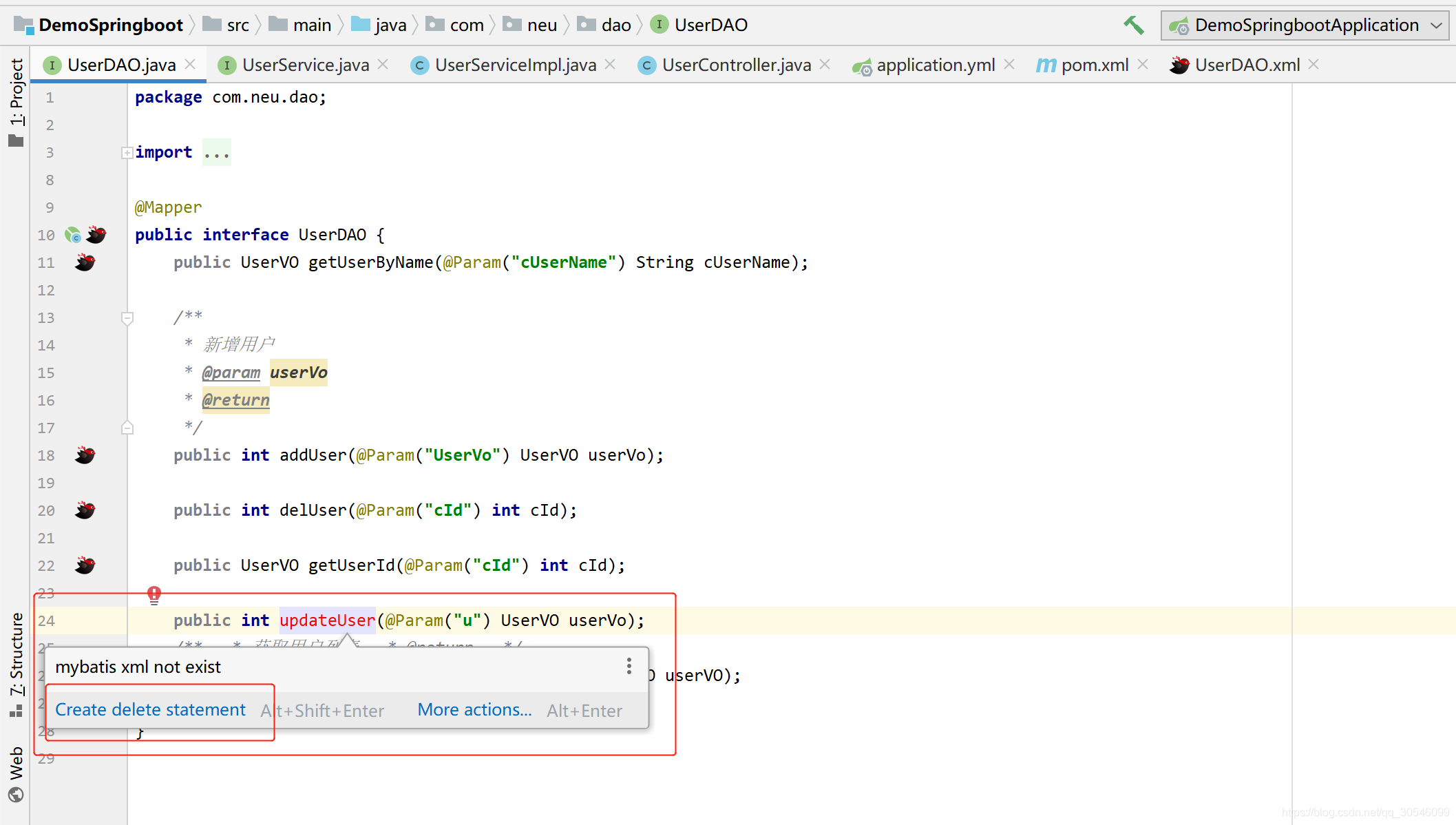 - 若是idea中有插件IDEA中mybatis插件自动生成手写sql的xml文件,数据处理层点击Create delete statement,则xxxDao.xml中直接生成MySQL的代码,直接添加sql即可,直接方便