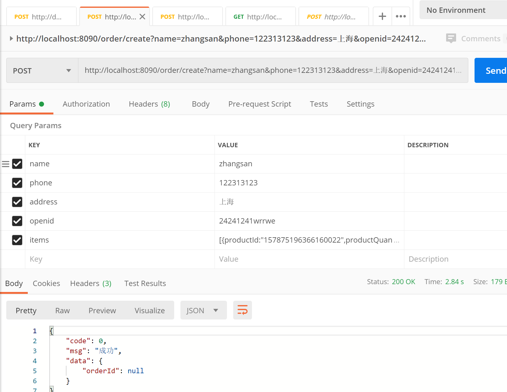 引入之后启动项目,我们用postman发送创建订单的请求,可以看到创建成功,如下图:
