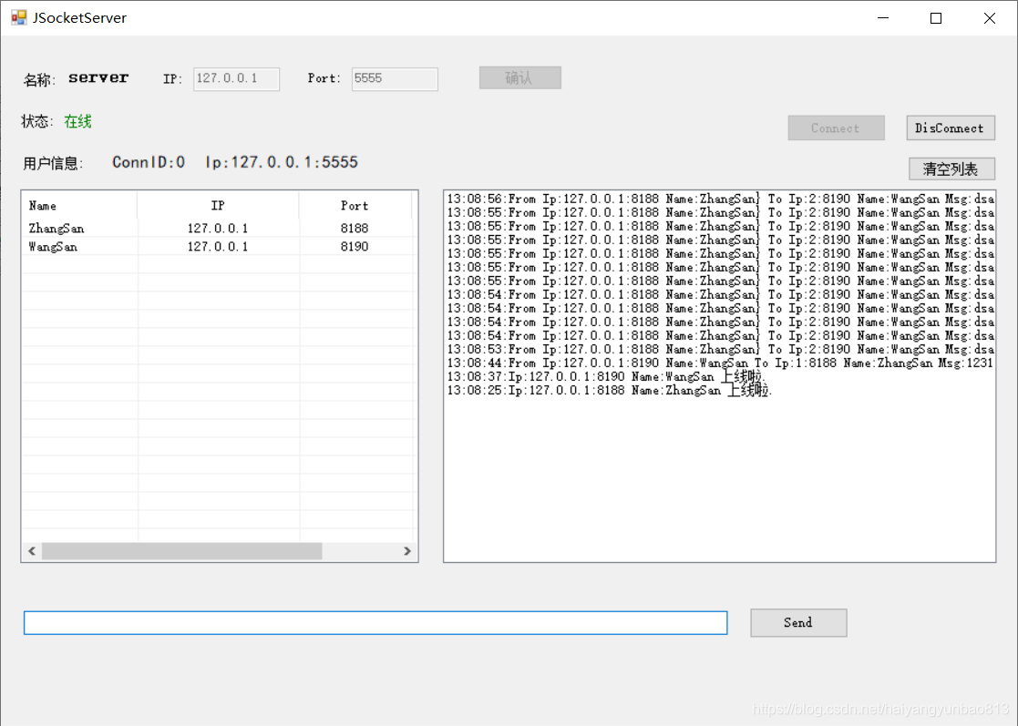 Client: EnHandleResult JSocketClient::OnConnect(ITcpClient* pSender, CONNID dwConnID) { TCHAR szAddress[50]; int iAddressLen = sizeof(szAddress) / sizeof(TCHAR); USHORT usPort; pSender->GetLocalAddress(szAddress, iAddressLen, usPort); if (m_connect_listen != nullptr) { m_connect_listen(dwConnID, szAddress, iAddressLen, usPort); } return HR_OK; } Server: EnHandleResult JSocketServer::OnAccept(ITcpServer* pSender, CONNID dwConnID, SOCKET soClient) { BOOL bPass = TRUE; TCHAR szAddress[50]; int iAddressLen = sizeof(szAddress) / sizeof(TCHAR); USHORT usPort; pSender->GetRemoteAddress(dwConnID, szAddress, iAddressLen, usPort); if (m_accepte_listen != nullptr) { m_accepte_listen(dwConnID, szAddress, iAddressLen, usPort, nullptr); } return bPass ? HR_OK : HR_ERROR; }这里有个问题,就是不知道 client 和 server 如何通过连接绑定额外数据(比如用户名,地址等信息),类似于 SetConnectionExtra() 和 GetConnectionExtra() 那种方式。我采用的办法是当server收到用户上线通知后,主动将用户的信息发送给client端,client端收到消息后,将绑定信息发送给server,server收到通知后,缓存到集合中,然后将在线的用户通过json的方式发送给client端。(这种方式感觉不是很合理,暂且这么做把,以后再优化,有小伙伴知道的,麻烦指导一二。)