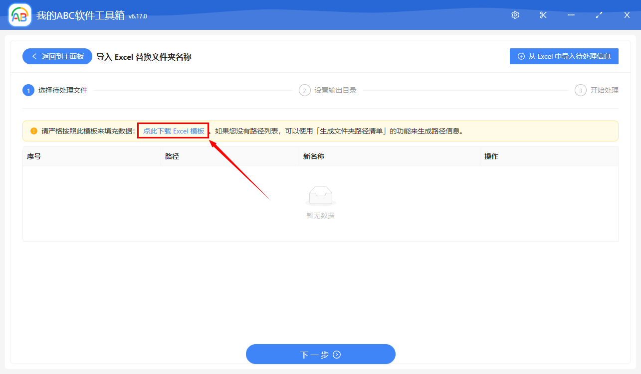 在这个界面,我们需要点击红色框框部分的 Excel 模板,然后在 Excel 模板中建立好修改前和修改后名称的关系,如下图: